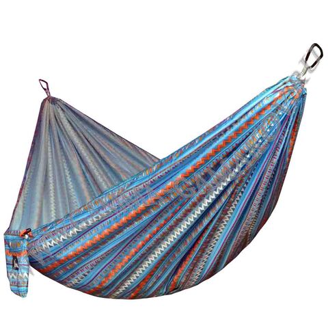 ▪ Туристический гамак - это практичный и компактный вид гамака. Своими свойствами он обязан материалу, из которого изготовлен, как правило это парашютный шёлк или другие современные синтетические материалы, которые используют для пошива туристического снаряжения. Подобная ткань имеет следующие характеристики: лёгкость, компактность, прочность, не боится влаги и более устойчива к прямым солнечным лучам. Благодаря этому гамак подойдёт всем любителям активного отдыха на природе. Он легко поместится в небольшой рюкзак, при этом его вес для большинства моделей составит около 500 грамм. Таким образом его без проблем можно взять с собой в любой пеший или вело поход. Но этим не ограничивается его применение. Гамак также отлично будет смотреться в вашем палаточном лагере или автокемпинге, его можно подвесить на даче или взять с собой на пляж, а при желании можно легко использовать внутри помещения вашего дома или даже офиса. Если гамак намок под дождём просто оставьте его в подвешенном состоянии, и он быстро высохнет. Если гамак загрязнился его без проблем можно постирать в стиральной машине в режиме деликатной стирки.
