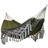 Данный гамак выполнен из натуральной хлопковой ткани, имеет форму кокона и бахрому по бокам! Гамак отлично подходит для двора частного дома или дачи. Представьте, как приятно будет отдохнуть от дачных работ, удобно устроившись в гамаке, развешенном в тени деревьев. На свежем воздухе можно и вздремнуть, ведь он полностью обволакивает тело, не позволяя выпасть из него. Так же гамак можно повесит и внутри самого дома или квартиры, сделав его изюминкой интерьера и зоной релаксации. А если вы предпочитаете отдыхать вместе с семьёй и друзьями в различных природных локациях, то этот двухместный гамак сделает ваш отдых более комфортным, ведь он способен выдержать двух человек, суммарным весом до 150 кг.
