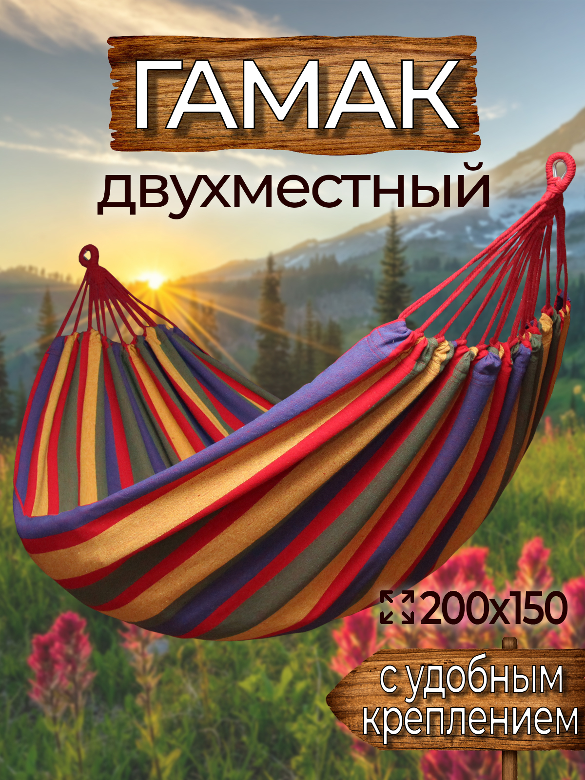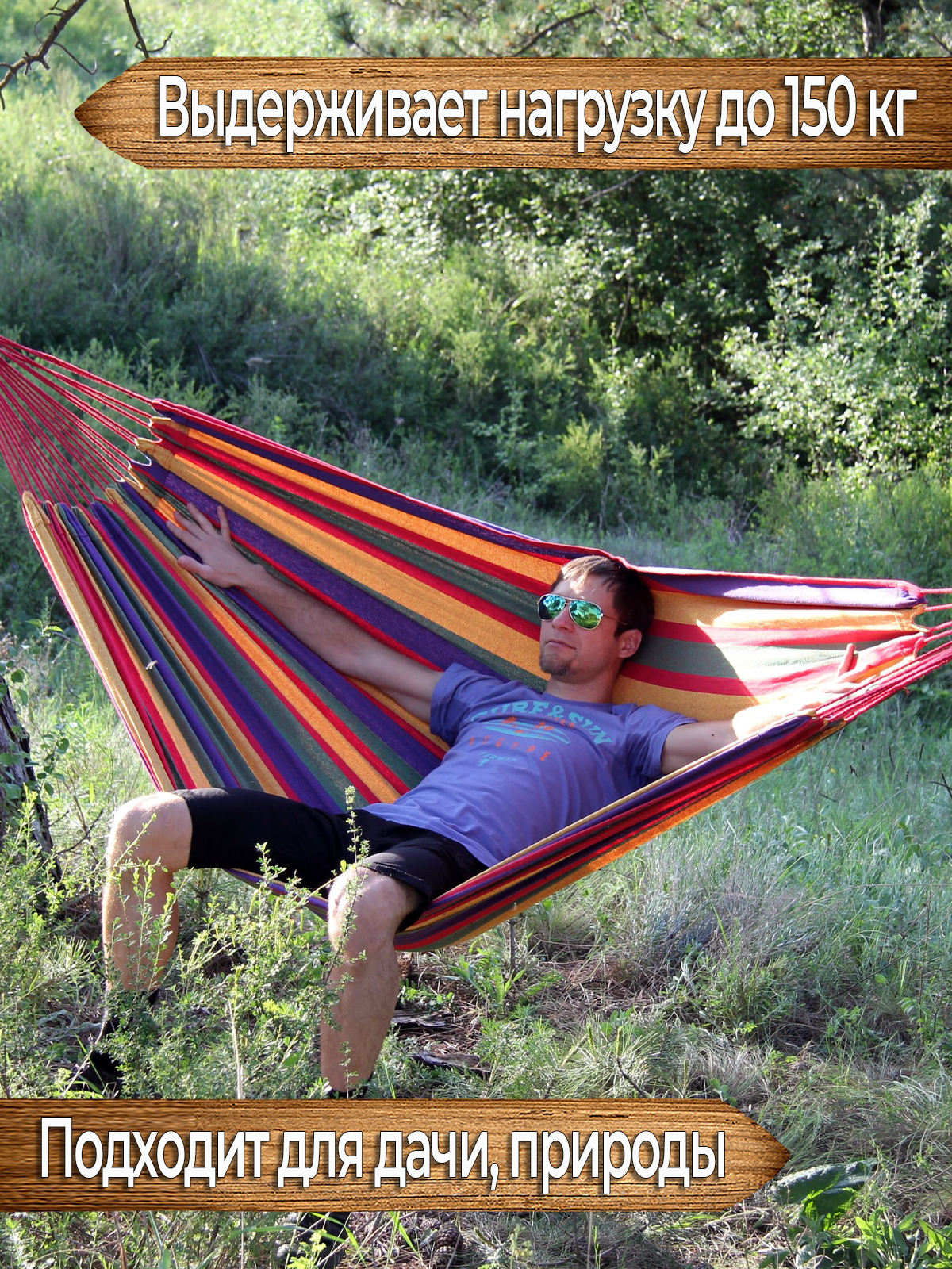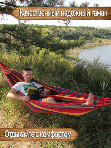 Этот двухместный комфортный гамак из натурального хлопка, станет отличной находкой для любителей отдыха на природе. А при желании и возможности, его можно разместить и дома, наслаждаясь отдыхом в гамаке круглый год! Оригинальная, красочная расцветка из 4 цветов задаст особенную атмосферу вашему интерьеру, а хлопок, из которого сделан гамак, будет приятно прилегать к телу и сделает отдых в нём еще более комфортабельным!