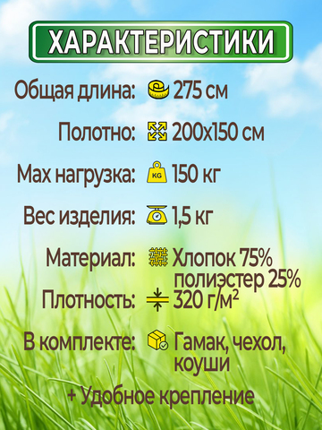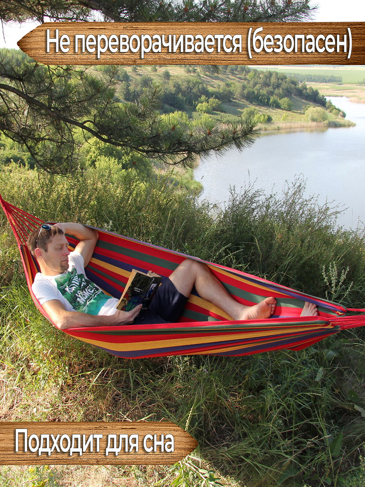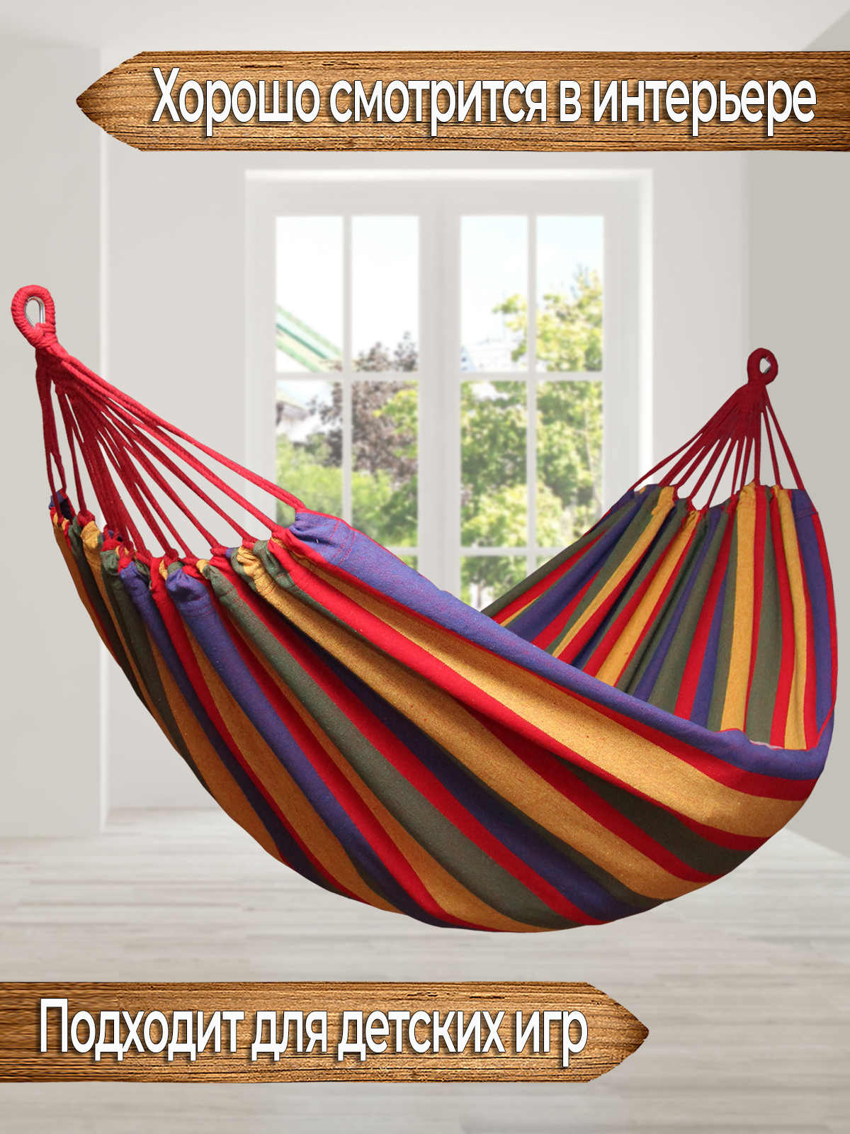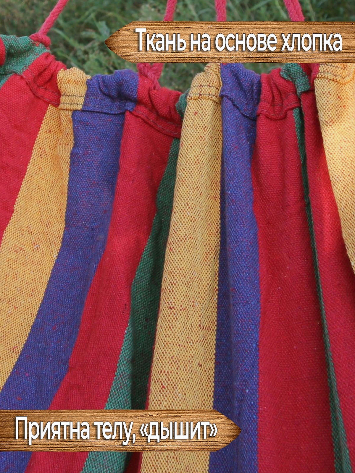 Этот двухместный комфортный гамак из натурального хлопка, станет отличной находкой для любителей отдыха на природе. А при желании и возможности, его можно разместить и дома, наслаждаясь отдыхом в гамаке круглый год! Оригинальная, красочная расцветка из 4 цветов задаст особенную атмосферу вашему интерьеру, а хлопок, из которого сделан гамак, будет приятно прилегать к телу и сделает отдых в нём еще более комфортабельным!