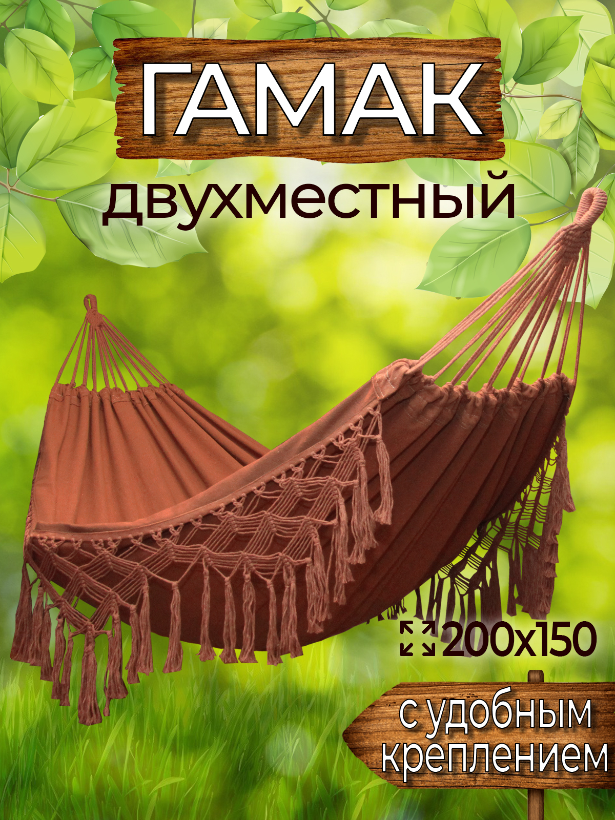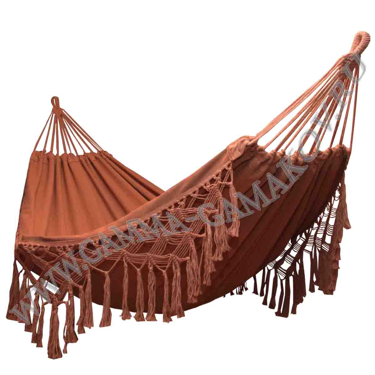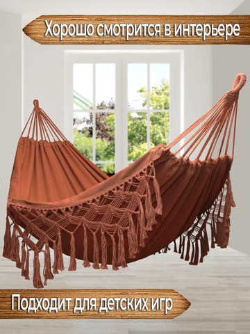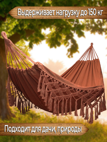 Данный гамак является просторным и вместительным. Купив его, вы станете обладателем модели с шириной полотна 150 см. Благодаря своим габаритам и грузоподъёмности в гамаке могут свободно разместиться два человека среднего телосложения. Хлопковая ткань отлично пропускает воздух, позволяя телу дышать и приятна на ощупь. В добавок у данной модели есть шикарная бахрома, которая придаст изюминку вашему гамаку и, как следствие, окружающему его интерьеру. Данный двухместный гамак имеет оригинальную однотонную бордовую расцветку, что поможет создать особую изысканную атмосферу.