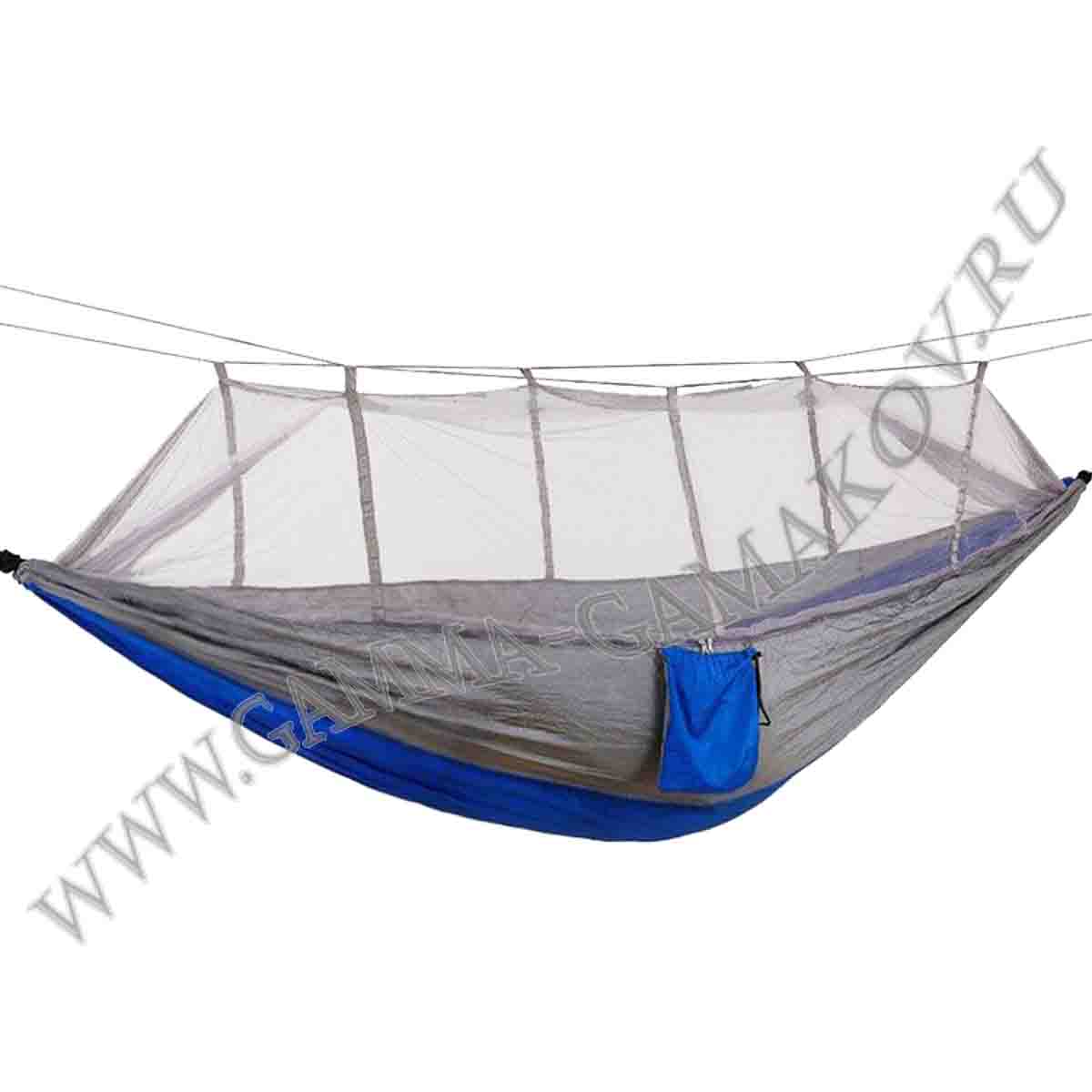 Данный туристический гамак подойдёт тем, кто отдыхая на природе, сталкивается со множеством летающих насекомых. Купив гамак с москитной сеткой, вы сможете значительно улучшить качество отдыха в подобных местах. Этот двухместный гамак способен выдержать вес двоих людей среднего телосложения, имеет приятную сине-серую расцветку, снабжён внутренним и наружным карманами. Подвесить его не сложнее чем обычный гамак, понадобится лишь установить две дополнительные верёвки (входят в комплект) на которых держится москитная сетка. Сам гамак можно закрепить к деревьям, входящими в комплект стропами, или дополнительно приобрести для этого верёвки. Если на горизонте нет летающих насекомых, москитную сетку можно не подвешивать, оставив её свисать с одного из краёв гамака, т.е. использовать данный девайс как классический туристический гамак.