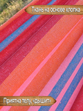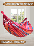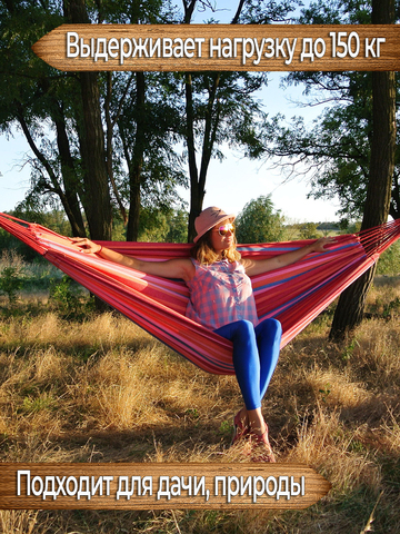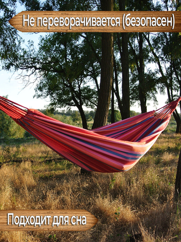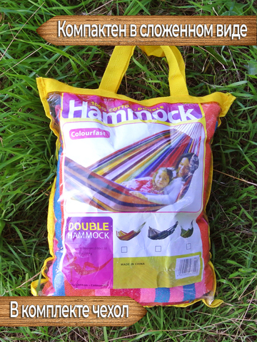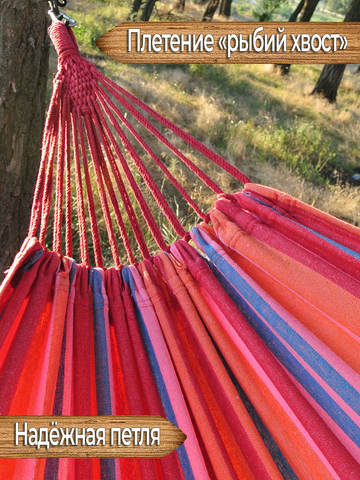 Данный гамак имеет яркую приятную расцветку, которая будет притягивать взгляд и станет украшением вашего палаточного лагеря. Чтобы расцветка дольше сохраняла изначальную сочность цветов, рекомендуется, по возможности, располагать гамак в тени, т.к. хлопок подвержен выгоранию на солнце, зато его мягкая приятная поверхность придётся по нраву и взрослым и детям. Соприкасаясь с такой поверхностью, кожа будет продолжать дышать и вы будете чувствовать себя максимально комфортно лёжа в гамаке. Для хранения и транспортировки изделия гамак дополнен двумя прочными верёвками и сумкой-чехлом.
