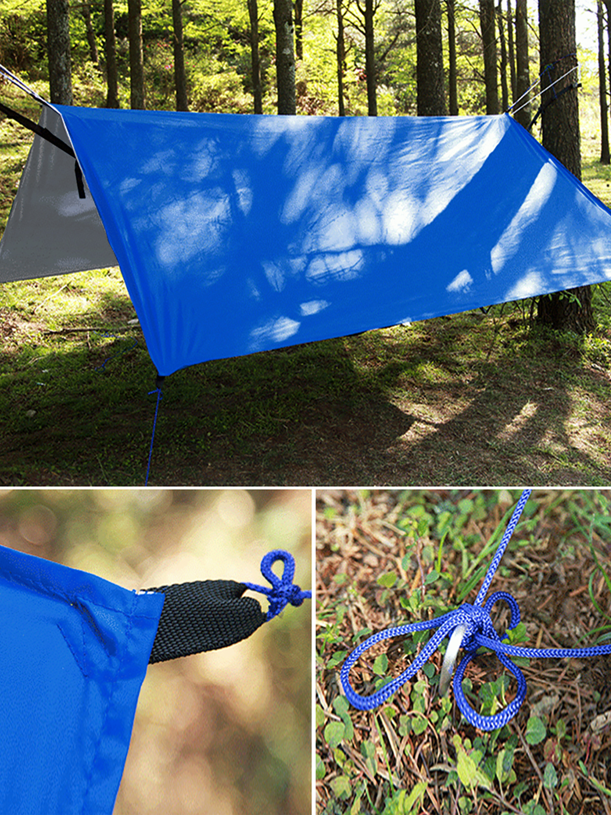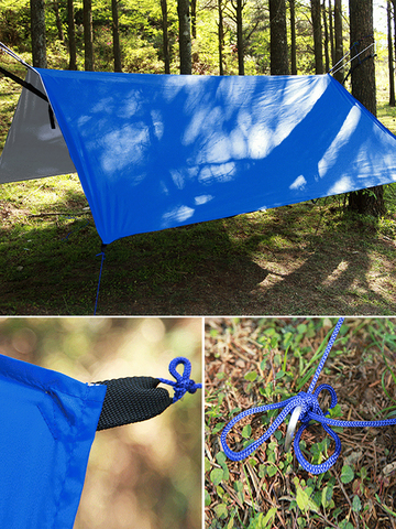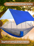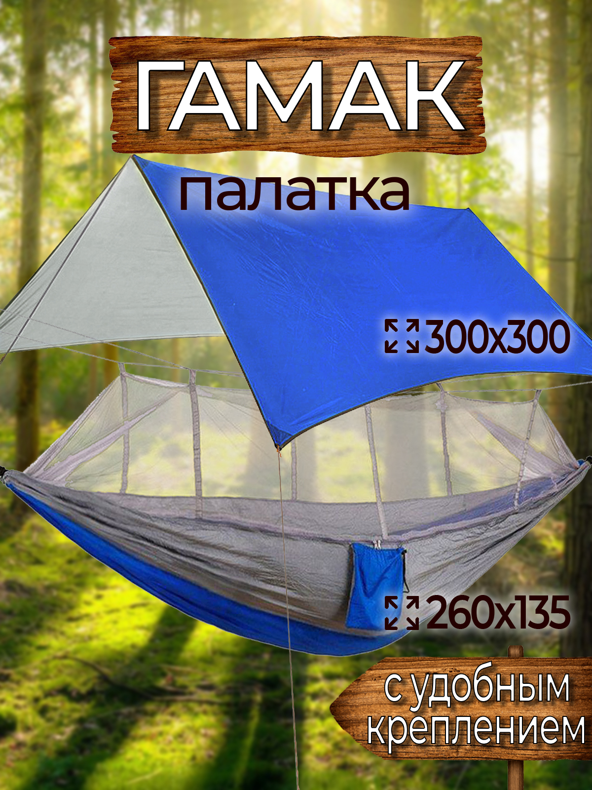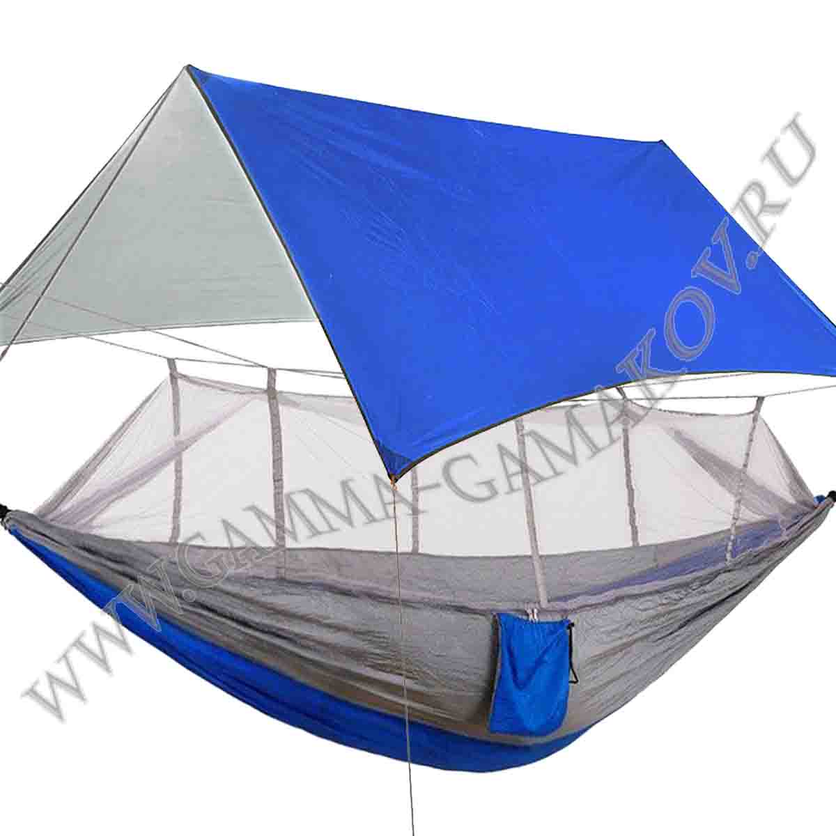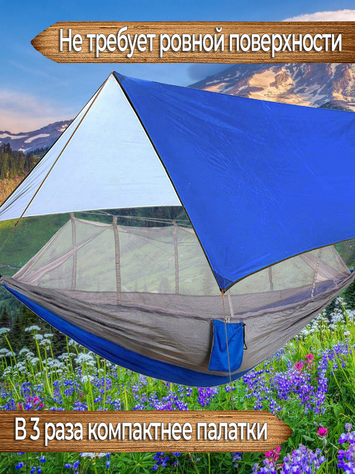 Гамак-палатка - это отличный вариант для тех, кто любит отдохнуть на природе несколько дней и не любит брать собой сильно много вещей. Данный туристический гамак подойдёт тем, кто, отдыхая на природе, сталкивается со множеством летающих насекомых. Купив гамак с москитной сеткой, в комплекте, с тентом, вы сможете значительно улучшить качество отдыха в подобных местах. Этот двухместный гамак способен выдержать вес двоих людей среднего телосложения, имеет приятную сине-серую расцветку, снабжён внутренним и наружным карманами. Подвесить его не сложнее чем обычный гамак, понадобится лишь установить две дополнительные верёвки (входят в комплект) на которых держится москитная сетка. Сам гамак можно закрепить к деревьям, входящими в комплект стропами, или дополнительно приобрести для этого верёвки. Если на горизонте нет летающих насекомых, москитную сетку можно не подвешивать, оставив её свисать с одного из краёв гамака, т.е. использовать данный девайс как классический туристический гамак.