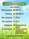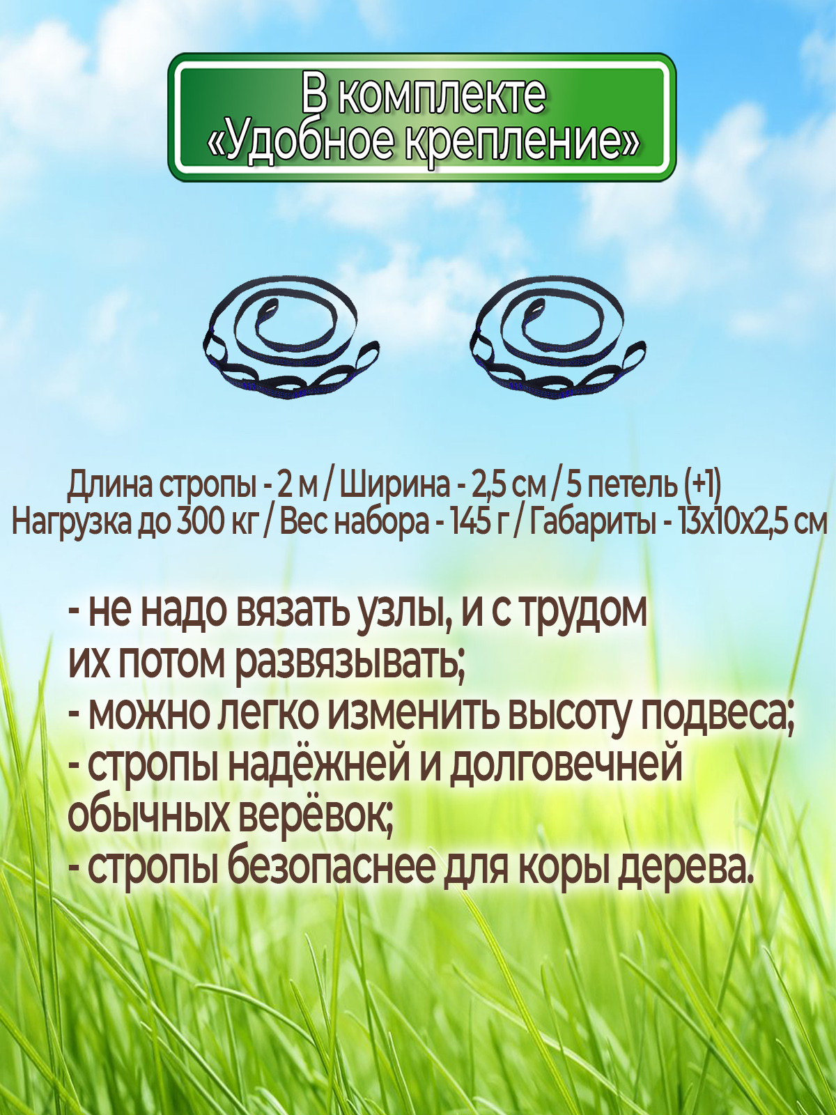 В комплекте к гамаку (от производителя) идут 2 обычные стропы, но мы добавили ещё «Удобное крепление» в виде двух строп с петлями. Особенности и преимущества данного крепления описаны на фото. Рекомендуем использовать именно его, а в случае большого расстояния между точками подвеса, вы можете соединить оба варианта, нарастив, таким образом, общую длину крепления.