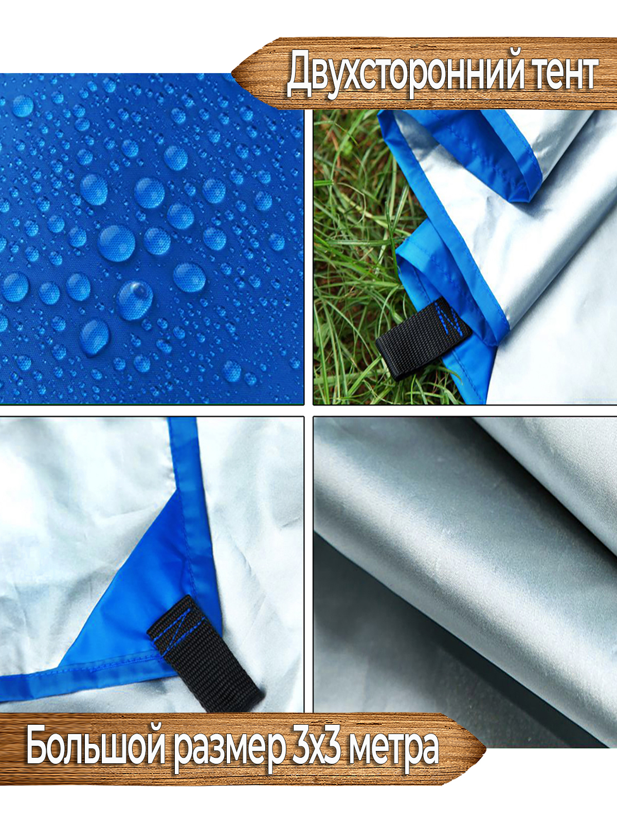 Тент имеет компактные размеры в сложенном виде и небольшой вес. Его размеры в разложенном виде 3 на 3 смогут спрятать от дождя или солнца компанию средних размеров. Часто бывает, что выезд на природу уже запланирован, но в последний момент на небе появляются тучки. В этом случае тент станет отличным страховочным элементом на случай дождя. Пребывание под ним в момент непротяжённого дождя создаст особую душевную обстановку и атмосферу уюта. Отдых не будет испорчен, напротив, появится повод - для объединения всех членов компании в одном укромном месте.