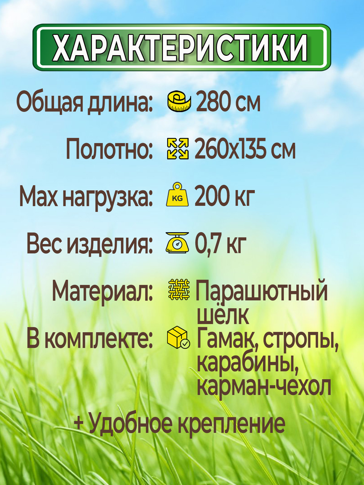 В комплекте к гамаку (от производителя) идут 2 обычные стропы, но мы добавили ещё «Удобное крепление» в виде двух строп с петлями. Особенности и преимущества данного крепления описаны на фото. Рекомендуем использовать именно его, а в случае большого расстояния между точками подвеса, вы можете соединить оба варианта, нарастив, таким образом, общую длину крепления.