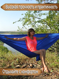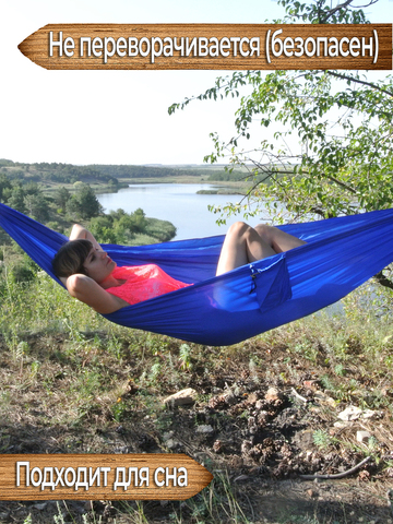 Надёжный двухместный гамак из парашютного шёлка прослужит вам долго и принесёт множество приятных эмоций. Решив купить гамак данной модели вы быстро оцените все его преимущества. Гамак способен разместить в себе двух человек суммарным весом до 200 кг, что делает его универсальным. Данная модель уже оснащена двумя карабинами и двумя верёвками, это позволяет повесить гамак сразу после приобретения, без необходимости в доукомплектовке. Приятная синяя расцветка гамака хорошо впишется в окружающую обстановку, где бы вы не развесили данный гамак, на природе, на даче или у себя дома.