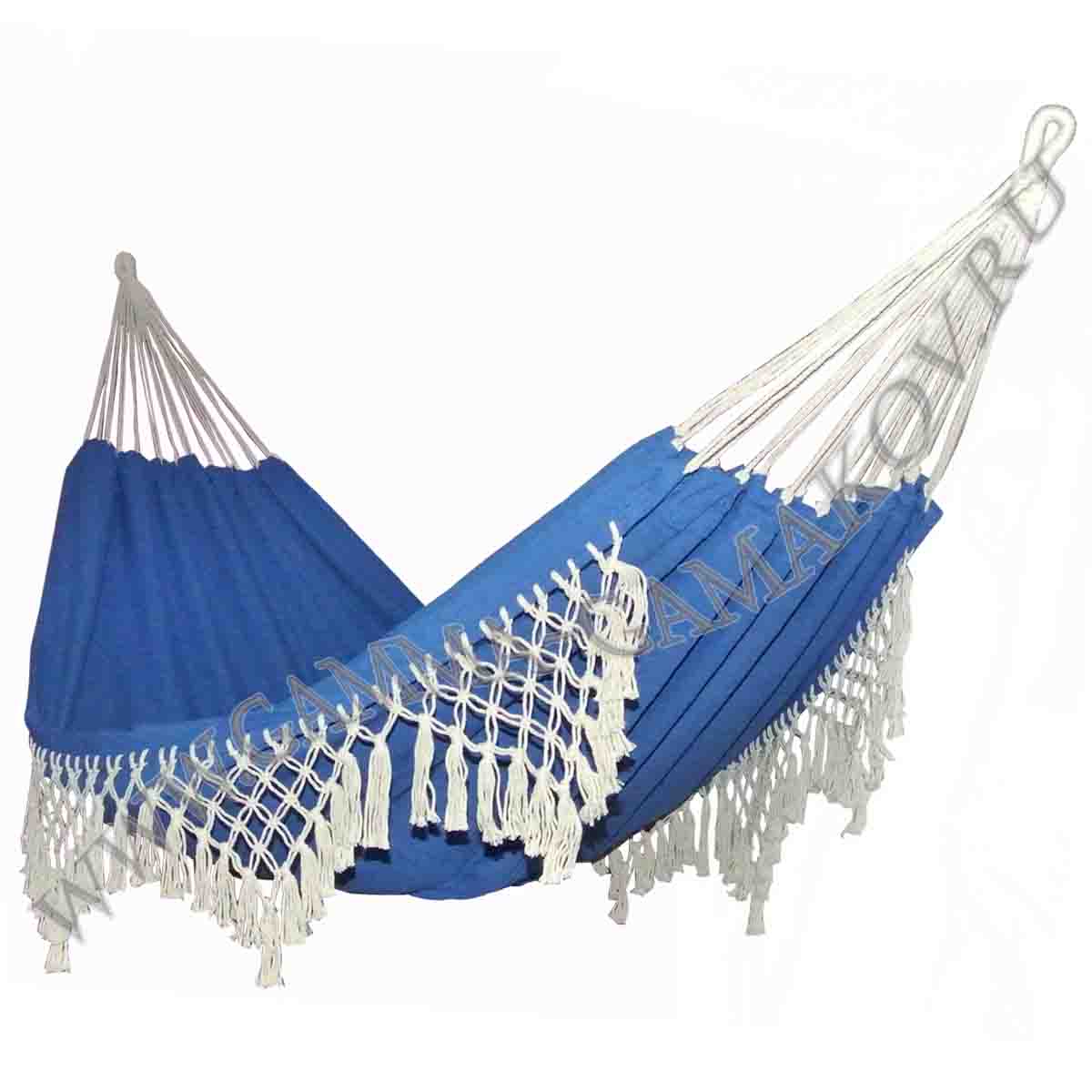 Данный хлопковый гамак имеет следующие размеры: ширина полотна 150 см, длина полотна 200 см, общая длина 310 см. Таким образом в нём могут поместиться два человека, суммарным весом до 150 кг. Приятная глазу небесно-синяя расцветка отлично впишется в любой природный интерьер, а длинная бахрома гамака добавляет ему особую эксклюзивность. А в холодное время года, гамак способен украсить ваш дом, для этого лишь надо закрепить два кронштейна или анкерных болта между двумя стенами вашей комнаты или балкона. Материал на основе хлопка приятный на ощупь и отлично дышит, забравшись в гамак вы почувствуете, как неведомая сила удерживает вас в нём и вам ещё долго не захочется его покидать.