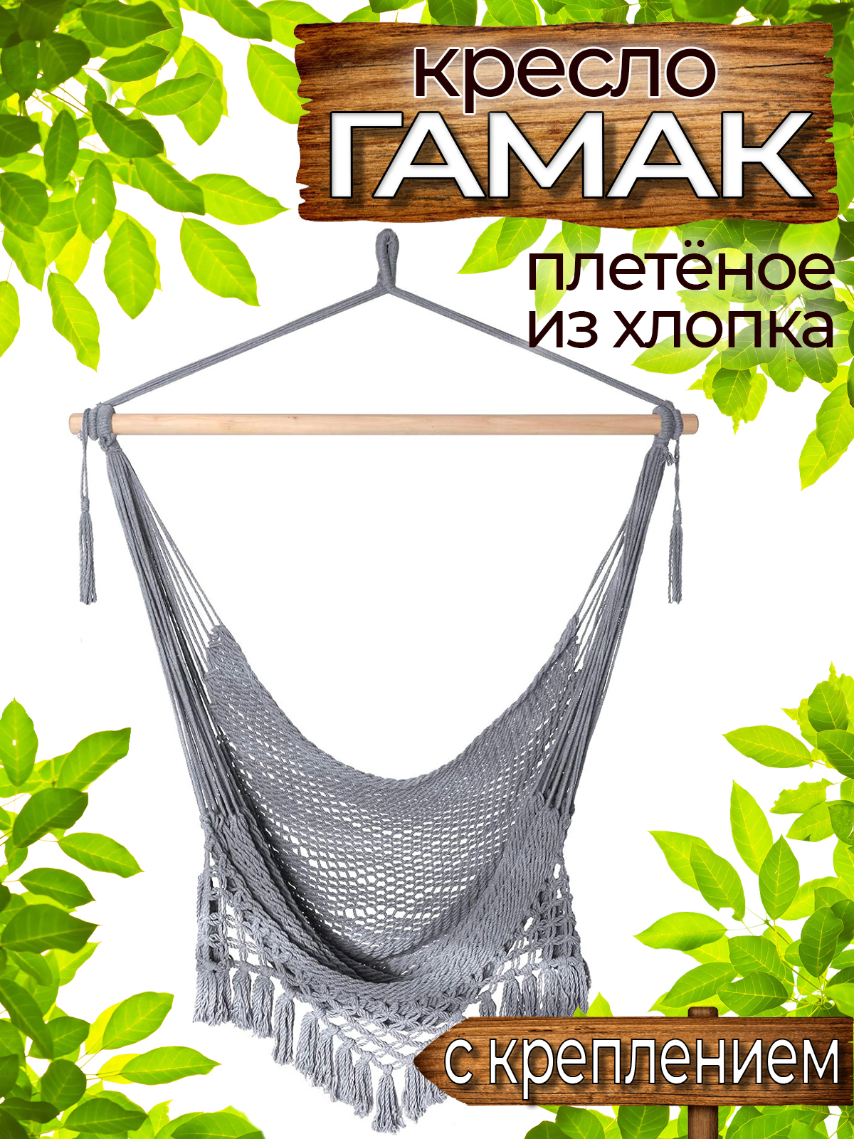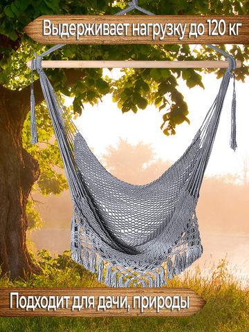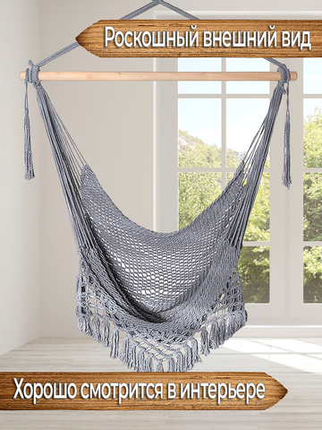 Рекомендуем вам обратить внимание на это прекрасное кресло-гамак нейтрального серого цвета. Бахрома придаёт ему особый шарм, а хлопковый шнур, из которого сделано кресло, наиболее комфортен для тела. При этом мелкое плетение шнура позволяет креслу принимать разные размеры в зависимости от пожеланий его пользователя. Компактные размеры гамака в сложенном виде позволяют легко его хранить и транспортировать. В подвесном кресле с легкостью может поместиться один взрослый или двое детишек, которые с радостью смогут использовать такое кресло как качели.