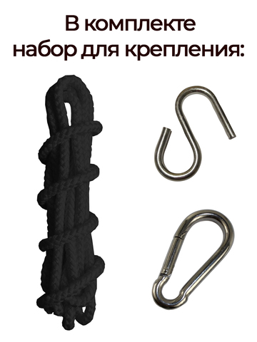 В комплекте к креслу-гамаку идёт система крепления – верёвка, карабин и s-крепление. Для крепления кресла к верёвке, на краю верёвки можно завязать петлю (узел простой проводник). Далее соединить петлю верёвки с петлёй гамака при помощи s-крепления. Прикрепить верёвку к точке подвеса можно разными способами (для этого удобно использовать карабин). Если вы крепите верёвку к ветви дерева, важно чтоб при раскачивании в кресле, верёвка не тёрлась активно о кору дерева. Для этого можно сделать несколько оборотов вокруг ветви и плотно затянуть верёвку.