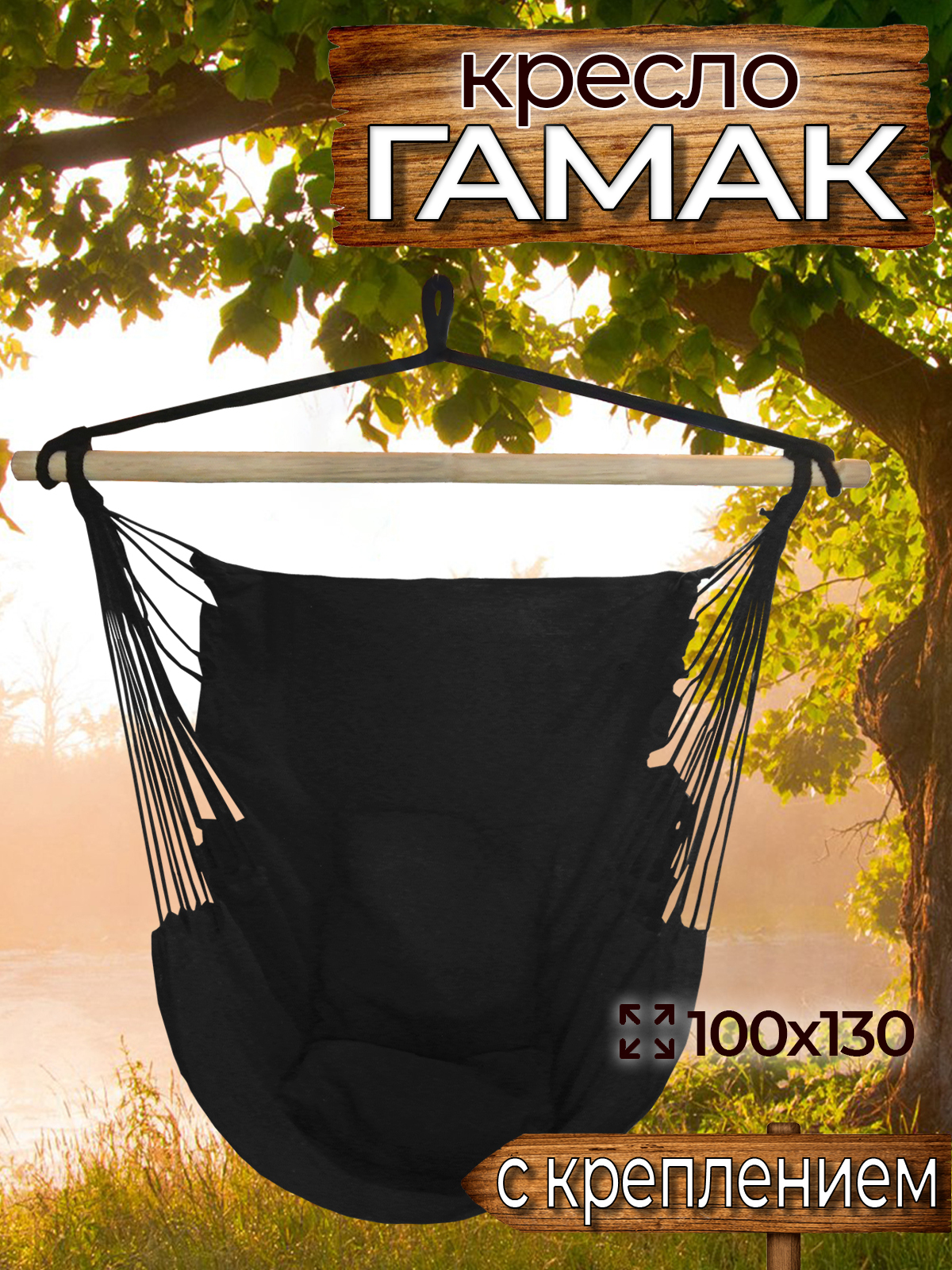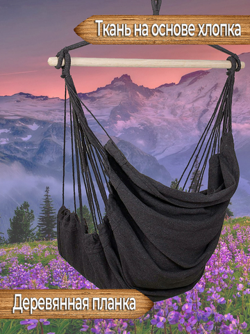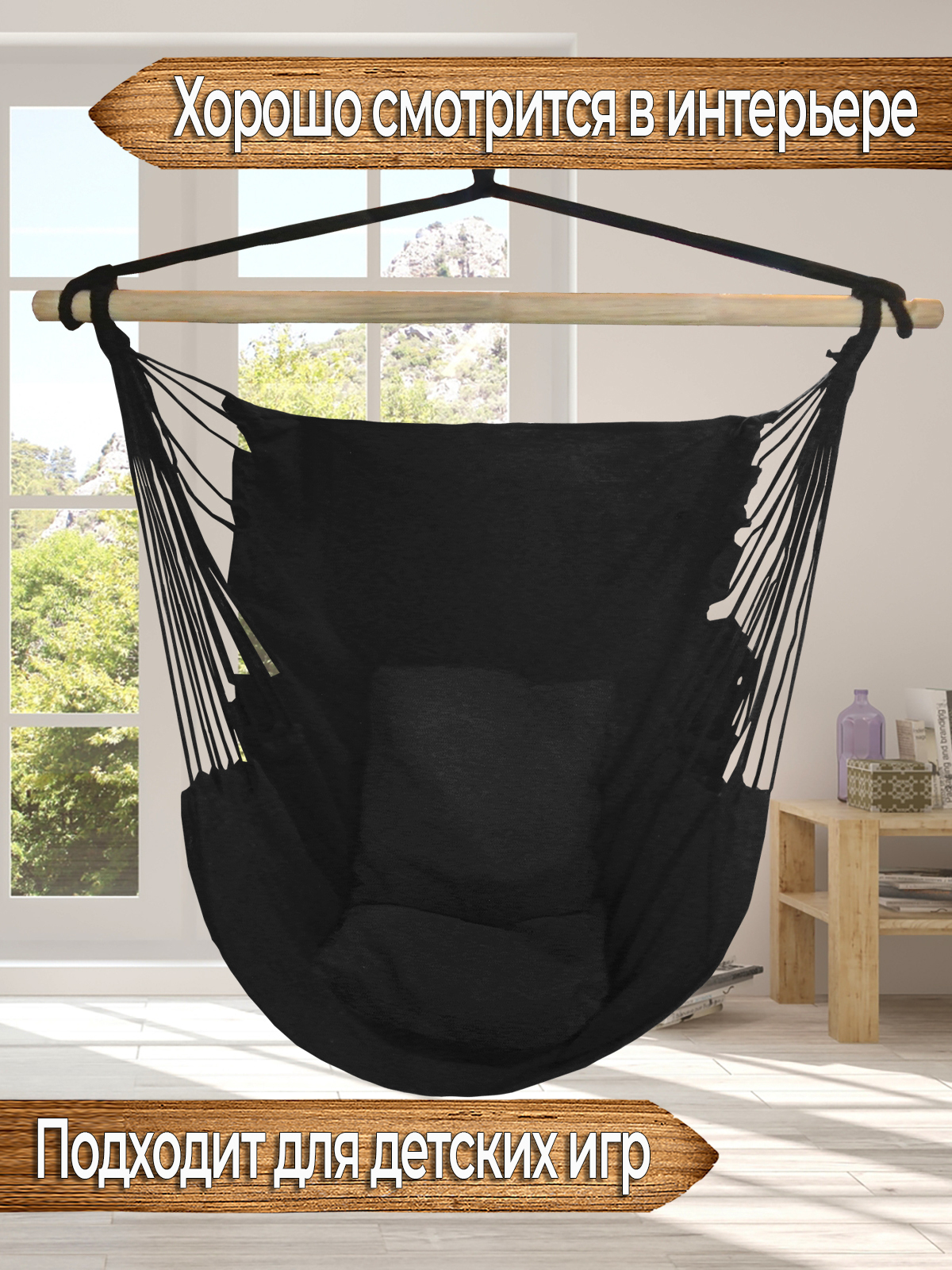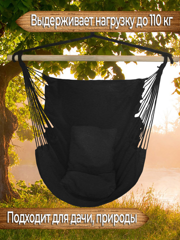 Если вы давно мечтаете обустроить зону релакса в своём саду или доме, то простым и доступным вариантом для этого может стать покупка данного кресла-гамака. Изысканный и практичный чёрный цвет подчеркнет ваш вкус, а две подушки, входящие в комплект, добавят комфорта и будут способствовать тому, чтобы кресло выглядело более интересным. Основной состав материала кресла – хлопок, это натуральный материал, который хорошо дышит и приятен при контакте с открытыми участками тела. Небольшое добавление полиэстера делает ткань более прочной и износостойкой. Отдых в таком кресло-гамаке доставит вам множество незабываемых и приятных моментов. В нём удобно читать книгу, пользоваться гаджетами или просто релаксировать глядя в даль и слегка покачиваясь. Кресло также удобно брать с собой при выездах на природу, компактные размеры и вес кресла в сложенном виде этому отлично способствуют. А если вместе с вами дети, то они смогут часами играть с данным креслом, используя его как качели.