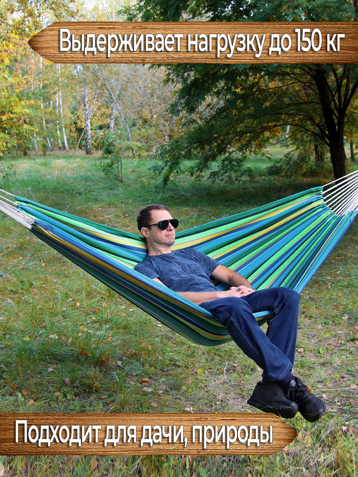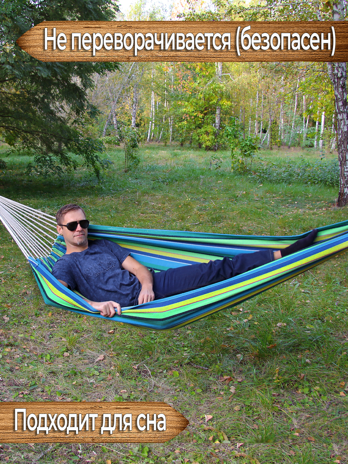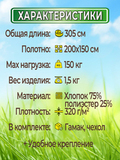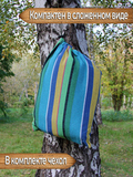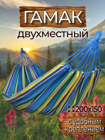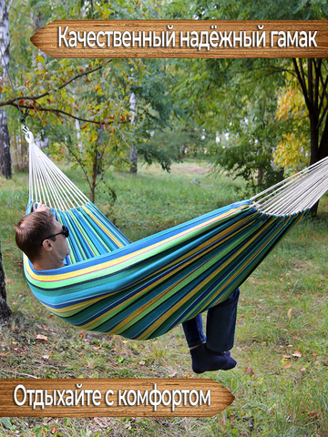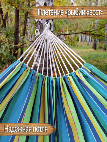 Это отличный недорогой двухместный подвесной гамак без планок. Купить его можно как для дачи или отдыха на природе, так и для того чтобы подвесить в квартире или на балконе. Данный гамак имеет широкое полотно, за счёт чего полностью обволакивает всё тело лежащего в нём человека как кокон, поэтому спать в таком гамаке будет удобно и безопасно, вы можете не бояться случайно выпасть из него во сне. Также устойчивая конструкция гамака безопасна для детских игр (под присмотром взрослых). Хлопковая поверхность материала из которого изготовлен гамак позволит телу дышать и будет приятной на ощупь.