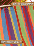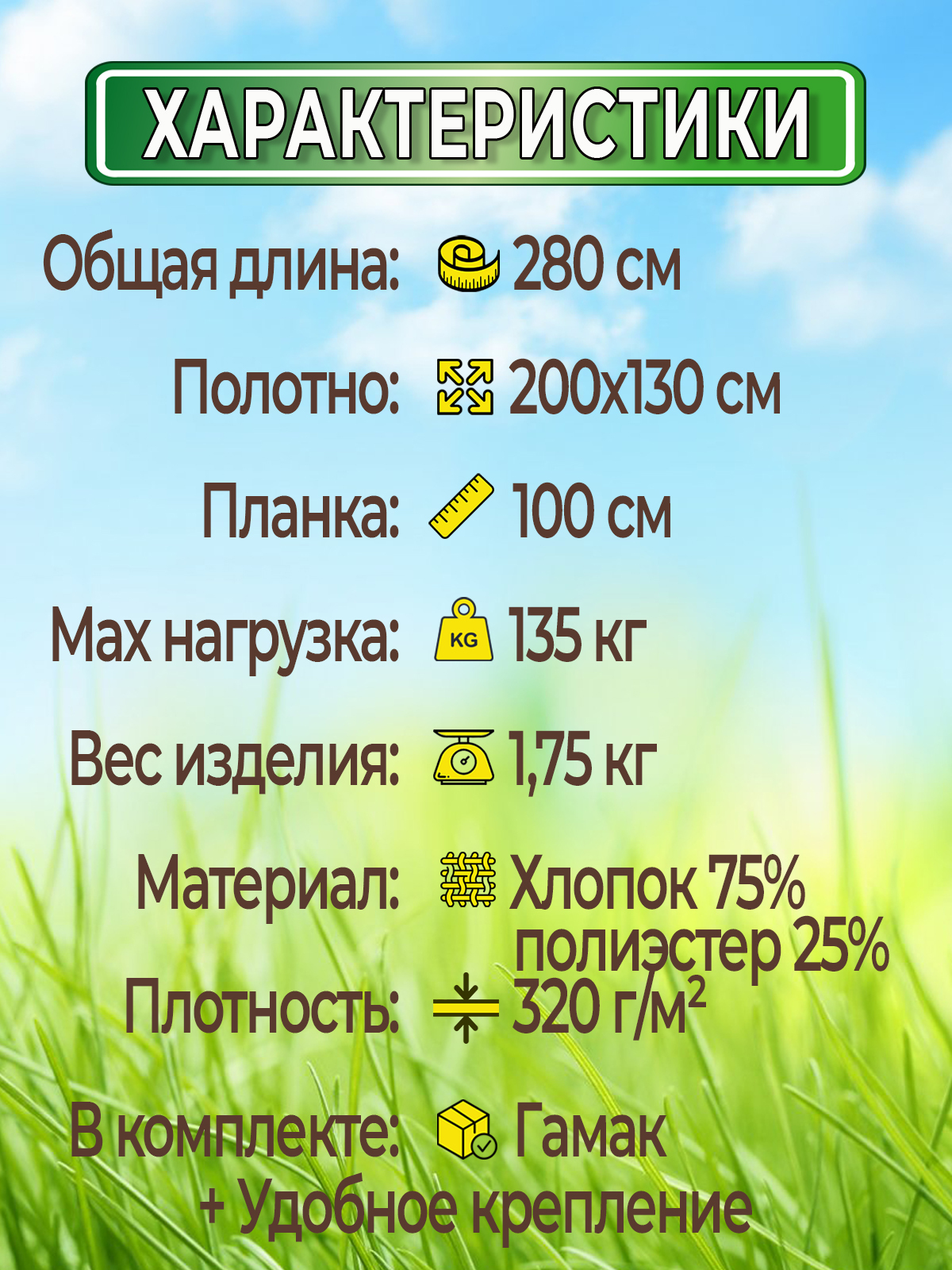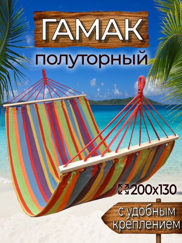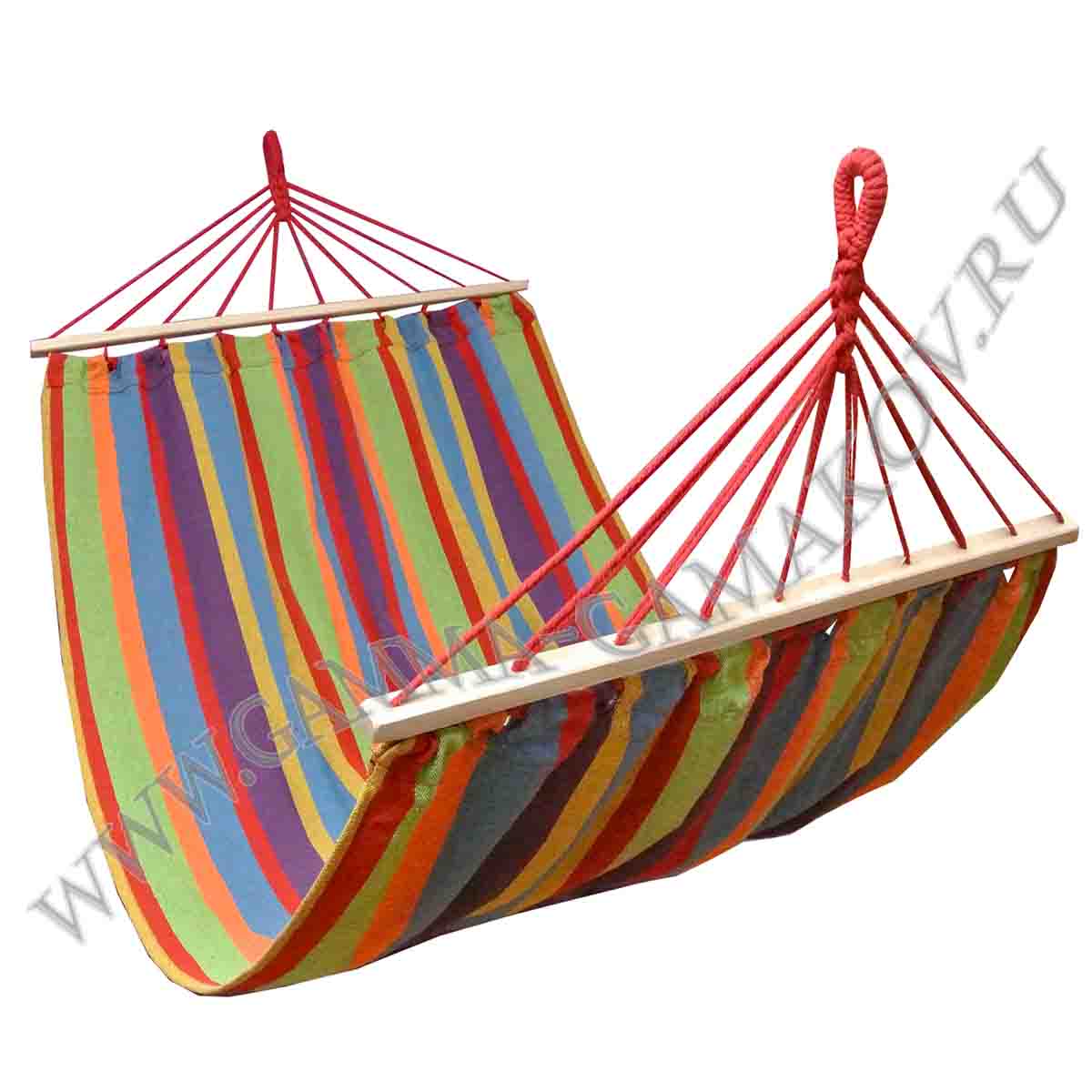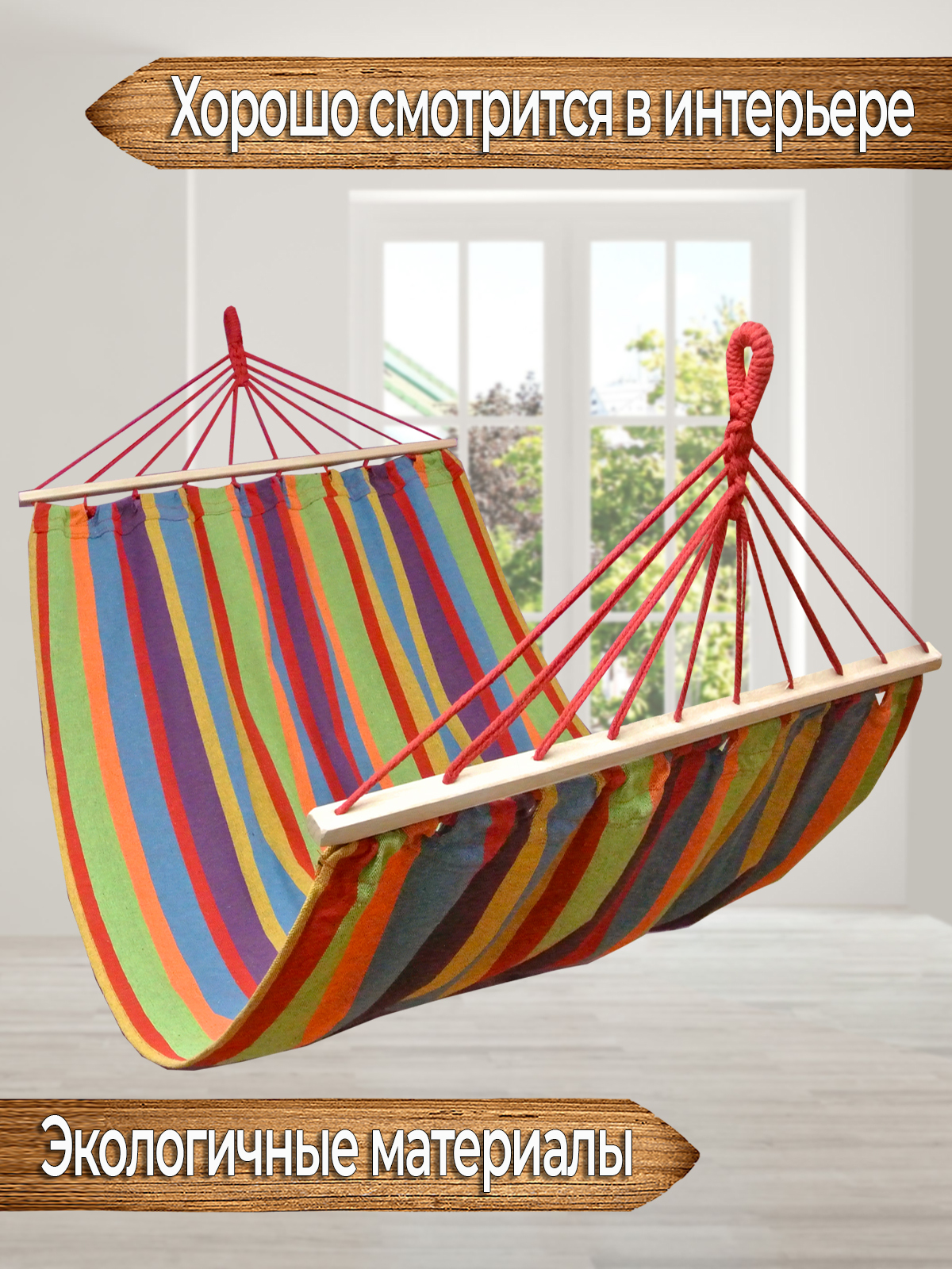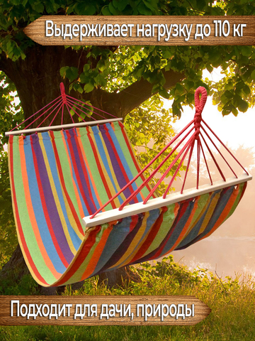 Отличный гамак в разноцветную полоску из натуральной ткани станет незаменимым атрибутом отдыха на природе или даче. Вы также можете купить этот гамак чтобы подвесить его на балкон или внутри вашей квартиры. Где бы вы ни проживали, будь это крупнейший мегаполис Москва или, например, провинциальный Таганрог, гамак станет для вас замечательным местом отдыха после тяжёлого рабочего дня. В тёплое же время года вы можете развесить его в тени деревьев и устроившись поудобнее наслаждаться отдыхом, слушая музыку или читая книгу. Также он будет отлично смотреться во дворе частного дома или лужайки палаточного лагеря. Гамак оснащён планками, что позволяет лёжа в нём, свободно лицезреть всю окружающую красоту природы. Планки гамака имеют ширину - 100 см, а полотно гамака ширину - 130 см. Планки не дают человеку "утонуть" в гамаке, не заслоняют обзор, а благодаря тому, что ширина полотна чуть больше ширины планок, гамак не так сильно подвержен переворачиванию. Гамак сделан из плотной и прочной хлопковой ткани с небольшим добавлением полиэстра, которая обеспечивает надёжность в эксплуатации, выдерживая до 135 кг нагрузки. Гамак можно подвешивать на стволы деревьев, столбы, крючки в стенах или специальную подставку, главное чтобы они были достаточно прочны.