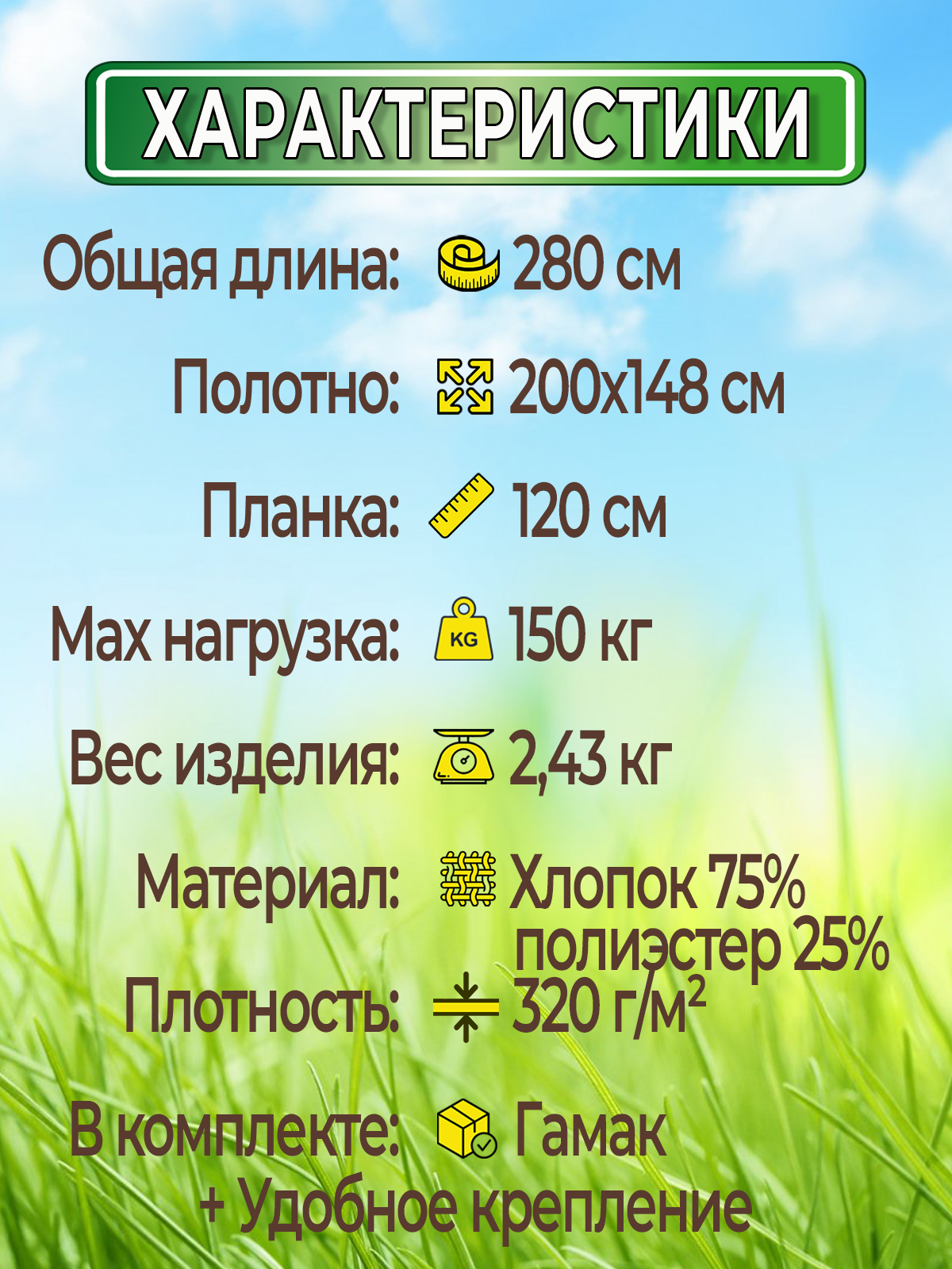 Планки данного гамака имеют размер - 120 см, а ширина полотна 148 см, благодарю чему гамак не так легко переворачивается. Длина полотна составляет 200 см, но может иметь небольшую погрешность ± 5 см.